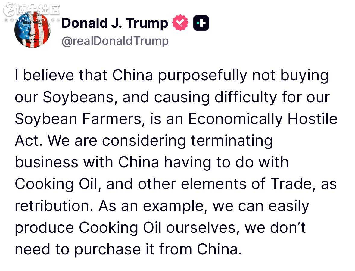 特朗普威胁禁止与中国进行食用油贸易,以报复不买大豆