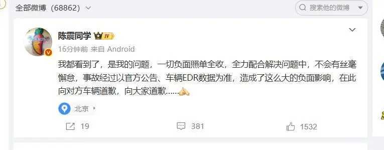 [中台港] 劳斯莱斯事故1天后,陈震发文道歉,承受流量的监督和批评 attach_img