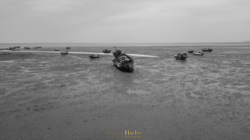 沿着海岸继续向前,滩涂上分布着众多的木质沉船。这里是片渔船墓场,附近很多渔船的晚年都在这片滩涂中度过。这些不规则散落的沉船,也成了很多游客拍照的好去处。
