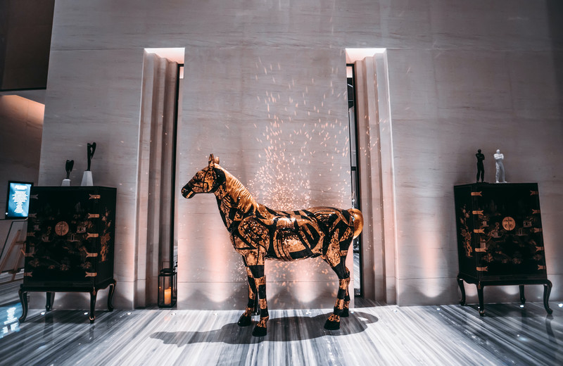 虽然每天有许多客人、工作人员在1楼电梯间往来走过,但是酒店还是在1楼放置了沙发茶几,赋予了这个空间休息功能。而旁边那些逗趣的雕塑,也是客人们高频拍照合影的对象。不经意的设计,最能提升酒店的整体质感。