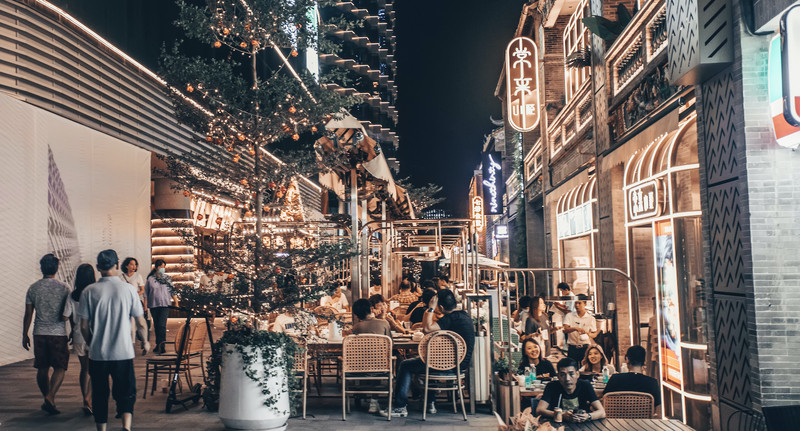 白天它是清丽脱俗的都市小花园,到了夜晚摇身一变成了觥筹交错的美食街。有了灯光的妆点,白天古朴厚重的青砖大屋,也开始洋溢起青春时尚的气息。