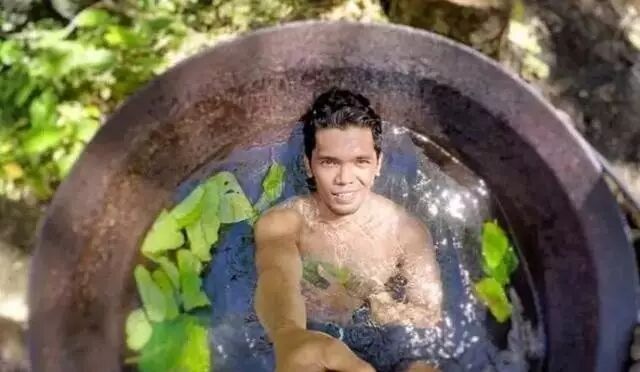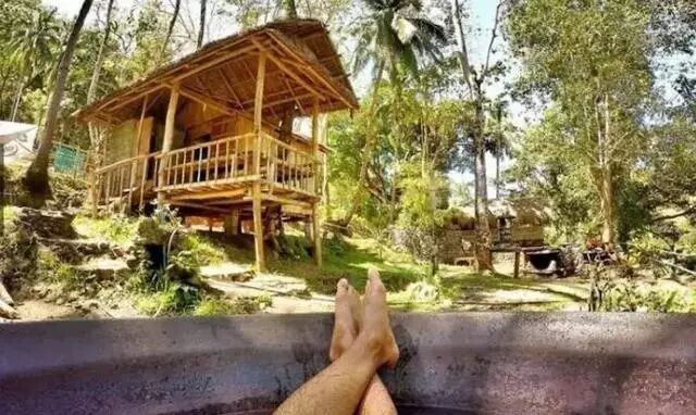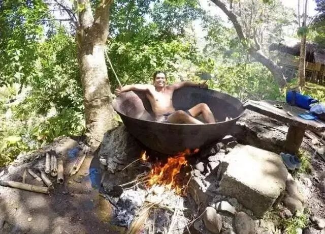 一游客在菲律宾旅游的时候,体验了一次青蛙温水的洗澡过程,图为迈克尔·迭斯,在仿古的省内游,非常兴奋的时候在度假Tibiao本省火浴服务体验热水澡。
