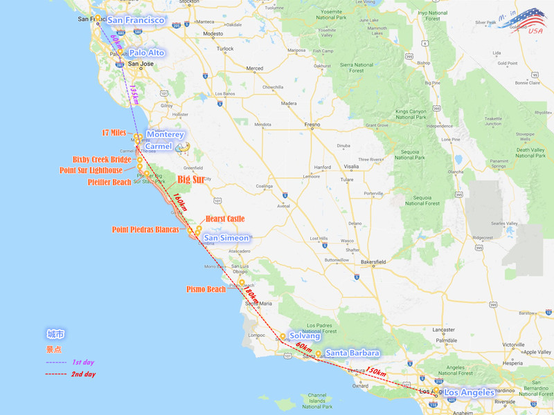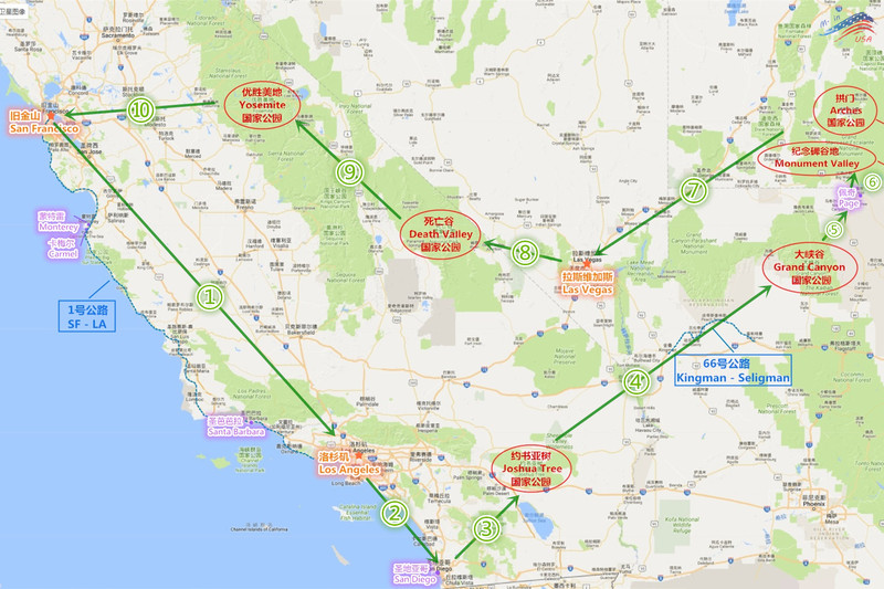 最优自驾路线:旧金山-1号公路-洛杉矶-圣地亚哥-约书亚国家公园(棕榈泉outlets)-66号公路-大峡谷国家公园-佩奇(马蹄湾/羚羊谷/鲍威尔湖)-纪念碑谷地-拱门国家公园-拉斯维加斯-死亡谷-优胜美地-旧金山