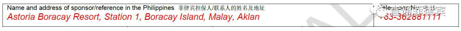 3.表格中间“Name and address of sponsor……”(在菲担保人姓名地址,电话写酒店信息)