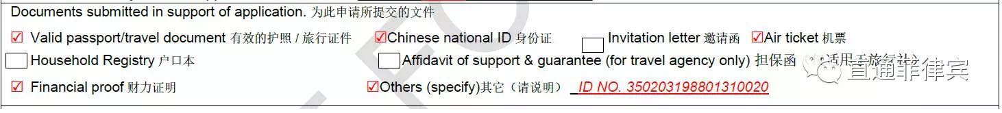 4.表格中间“Documents submitted in……”(在others 其他写上ID NO:……就是身份证号。未成年人不用填)