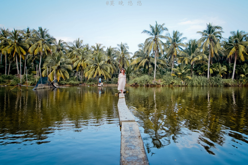 在椰林的边上就是一片水池,上面有木板架起来的小桥,周边所见除了椰子树还是椰子树,每一步一景都在诠释着这里为什么会被叫做“椰子洲岛”。