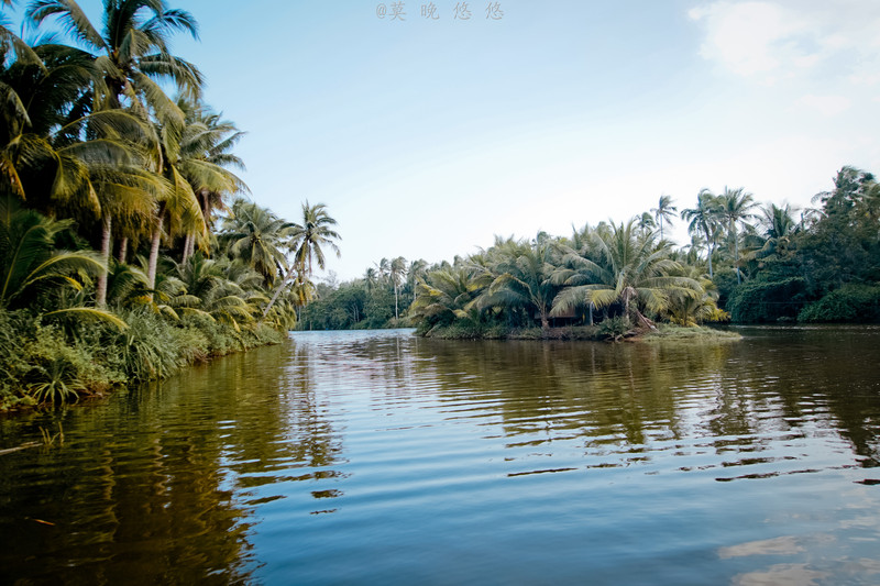 在岸这边看向来时的路,又是另外一番美景。此时,还善存一点太阳的余晖,它把对岸的椰子树林都照得金黄,连带着水里的倒影也摇曳着发亮。